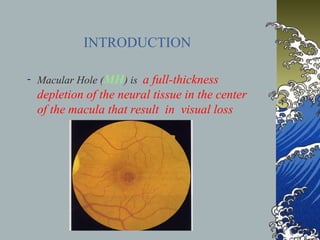 This document provides an overview of macular holes (MH), including their epidemiology, pathogenesis, classification, diagnosis, natural course, treatment, and outcomes. Some key points:
