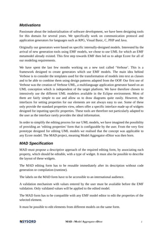 The document describes the Model Aggregator Editor (MAD), a tool designed to simplify and enhance the editing process of EMF models by providing configurable editing forms. It outlines the motivations behind MAD, its specifications, architecture, and integration into the Eclipse environment, emphasizing features such as bidirectional synchronization, use of query evaluators, and customizable editing experiences. The document further details implementation choices, the lifecycle of the tool, and specific functionalities including query chains and contextual variables, illustrating its flexibility and capability to handle various modeling tasks.