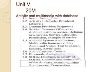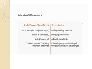 This document provides an overview of intents, activities, broadcast receivers, and services in Android mobile application development. It defines intents as actions that can be performed, such as starting an activity or service. It describes the two types of intents - implicit and explicit. It also covers the lifecycles of activities and broadcast receivers, and distinguishes between started and bound services. Examples are provided for creating applications that use intents, activities, broadcast receivers, and services.