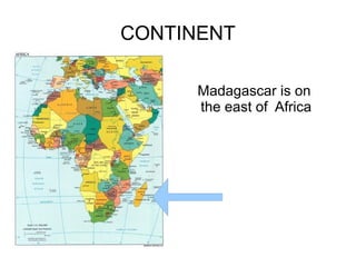 Madagascar is an island country off the southeastern coast of Africa. It has six autonomous provinces with Antananarivo as its capital city. The flag is white, red and green, and French and Malgache are the main languages. Andry Rajoelina has been president since 2009. The currency is the Malagasy ariary and notable monuments include the Azadi tower and Manjakamiadana Palace.