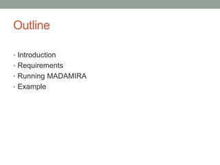 The document provides an overview of 'madamira', a system designed for morphological analysis and disambiguation of Arabic language texts, which helps to eliminate ambiguity in word meanings. It outlines the requirements for running the software, including necessary RAM and Java version, and describes its two operation modes: stand-alone and server-client mode. Additionally, it details the methods for data passing and receiving results in either XML or raw format.