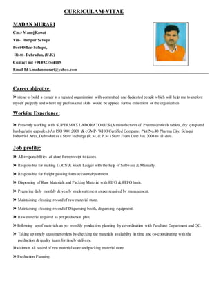 Madan Murari is seeking a career opportunity with a reputed organization. He has over 10 years of experience as a Store Incharge at Supermax Laboratories, an ISO and WHO certified pharmaceutical manufacturer. His responsibilities include managing raw material and packaging material stores, maintaining records and inventory, coordinating with production and quality teams, and ensuring timely delivery of customer orders. He has strong organizational skills and the ability to work independently and as part of a team. Madan holds a BA degree in Math and has knowledge of Microsoft Office and online software.
