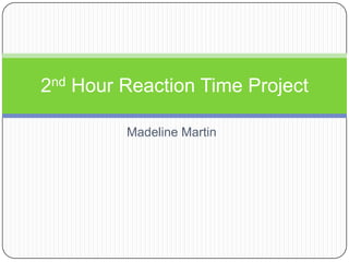 This document contains data from Madeline Martin's 2nd hour reaction time project. It includes student names, measurements of head size, ghost blaster and stopwatch scores, and gender. It analyzes the data with measures of center, box plots, graphs, and comparisons of variability and typical scores between girls and boys. The analysis concludes that girls are faster than boys based on the stopwatch data showing girls had higher minimum and more students in the highest scoring mode range.