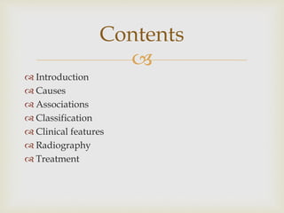 The document discusses Madelung's deformity, an abnormality of the distal radius characterized by ulnar and volar tilt with dorsal subluxation of the ulna. It explores its causes, associations, clinical features, classification, and treatment options, including conservative management and surgical interventions. Notable surgical techniques mentioned include radial osteotomies and excision of the ligament of Vickers, particularly for persistent deformities or pain.