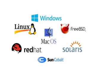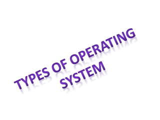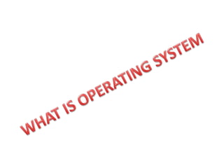 An operating system (OS) manages application programs and hardware devices. It determines which applications run and in what order, manages memory sharing between applications, and handles input/output to hardware. Popular desktop OSs include Windows, Mac OS, and Linux. Batch systems run jobs non-interactively while time-sharing systems allow interactive use by multiple users simultaneously. Distributed, network, real-time, and embedded OSs are designed for specialized environments. A library OS provides typical OS services as libraries to compose with applications.