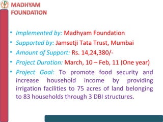 A one-year project funded by Jamsetji Tata Trust aimed to increase food security and household income for 83 households across 3 villages through the development of 3 diversion weir irrigation structures. So far, 23 households in Jaripada village have benefited from the irrigation of 30 acres of land. Work is ongoing for the other structures in Sana Tulabi and Jamuganda villages to irrigate a total planned area of 75 acres. Activities undertaken include community meetings, surveys, infrastructure development, and training in organic farming. Issues encountered include delays due to weather and infrastructure damage.