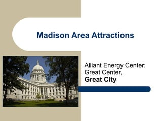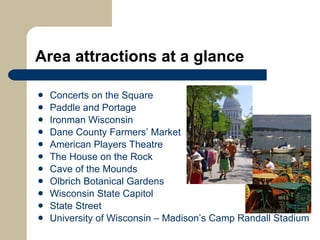 The document outlines key attractions in the Madison area, including the Alliant Energy Center and various events like the Dane County Farmers' Market and concerts on the square. It highlights notable locations such as the Wisconsin State Capitol, Olbrich Botanical Gardens, and the House on the Rock, each offering unique experiences. Additionally, it includes information on activities like the Ironman Wisconsin triathlon and Paddle and Portage canoe races.