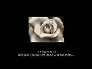 It is madness to judge all people or opportunities based on a single negative experience. One should not lose faith after a single unanswered prayer, failed effort, or betrayal, but instead remain persistent in seeking happiness each new day. Future success often comes after failure, so one should keep trying and not give up.