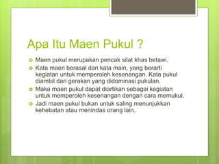 Maen pukul adalah seni bela diri khas Betawi yang melibatkan pukulan dan tendangan ke bagian tubuh di bawah pusar untuk hiburan. Terdapat beberapa aliran maen pukul, termasuk Cingkrik Goning yang diajarkan. Jurus-jurus maen pukul meniru gerakan hewan dan meliputi teknik dasar pertahanan dan penyerangan tanpa senjata.
