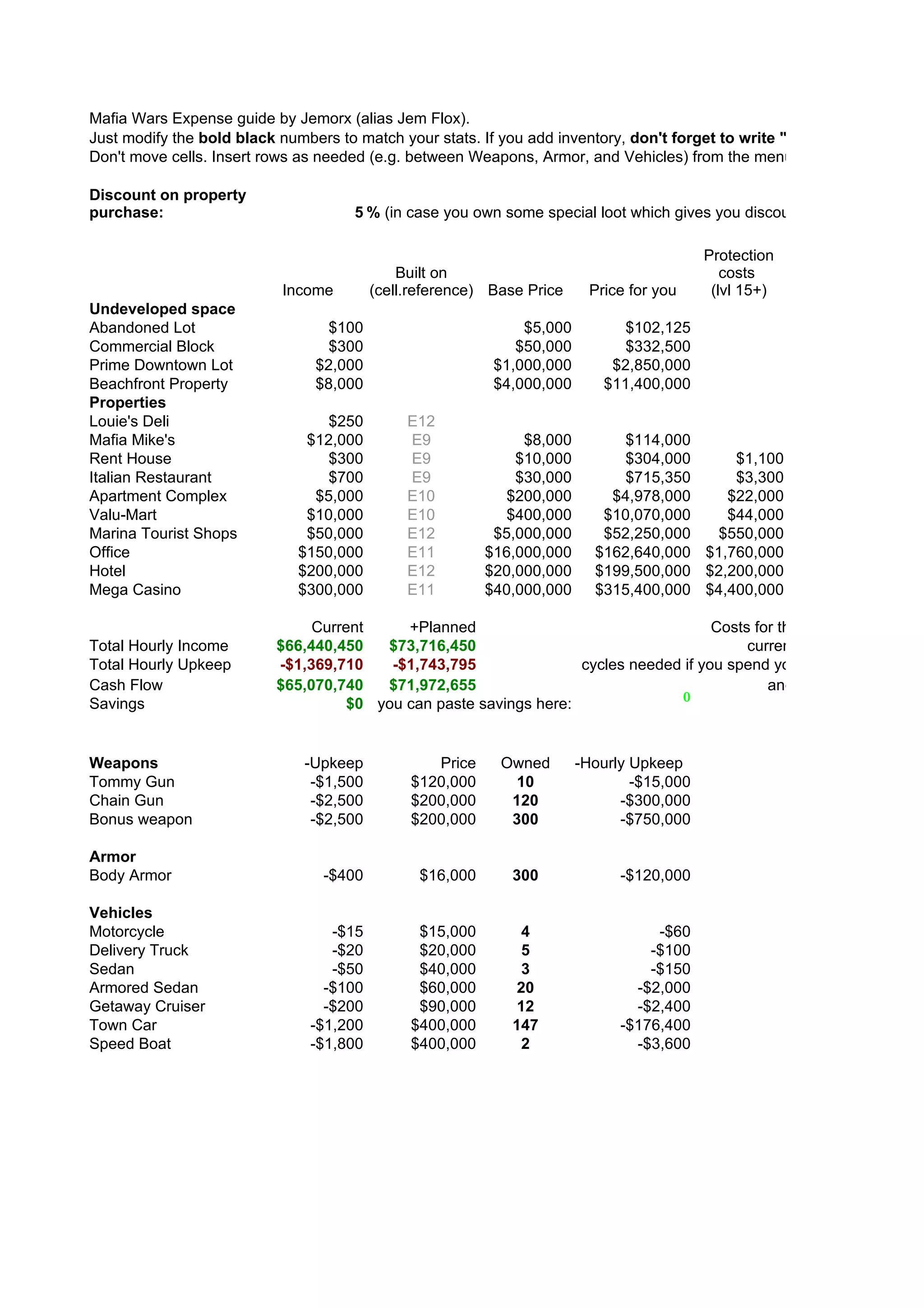 The document provides information on the income, costs, and payouts of different jobs and properties in Mafia Wars. It includes a table listing various jobs/roles (e.g. Street Thug, Associate, Soldier), the experience points and energy costs for each job, and the range of possible income payouts. Another section shows properties that can be purchased, their costs and income amounts. The document aims to help players understand the most profitable activities.