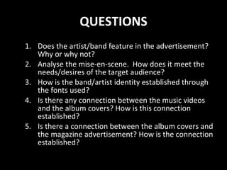 This document analyzes magazine advertisements for albums by different bands. It identifies common elements across the ads like listing the band name, record label, and album release date. Font and color schemes are also examined, as many draw direct connections to the album covers. The purpose of the ads is to promote and sell the bands' image and albums. Clues like minimalist designs and cartoon-like themes suggest the ads target an indie music audience rather than a mainstream one.