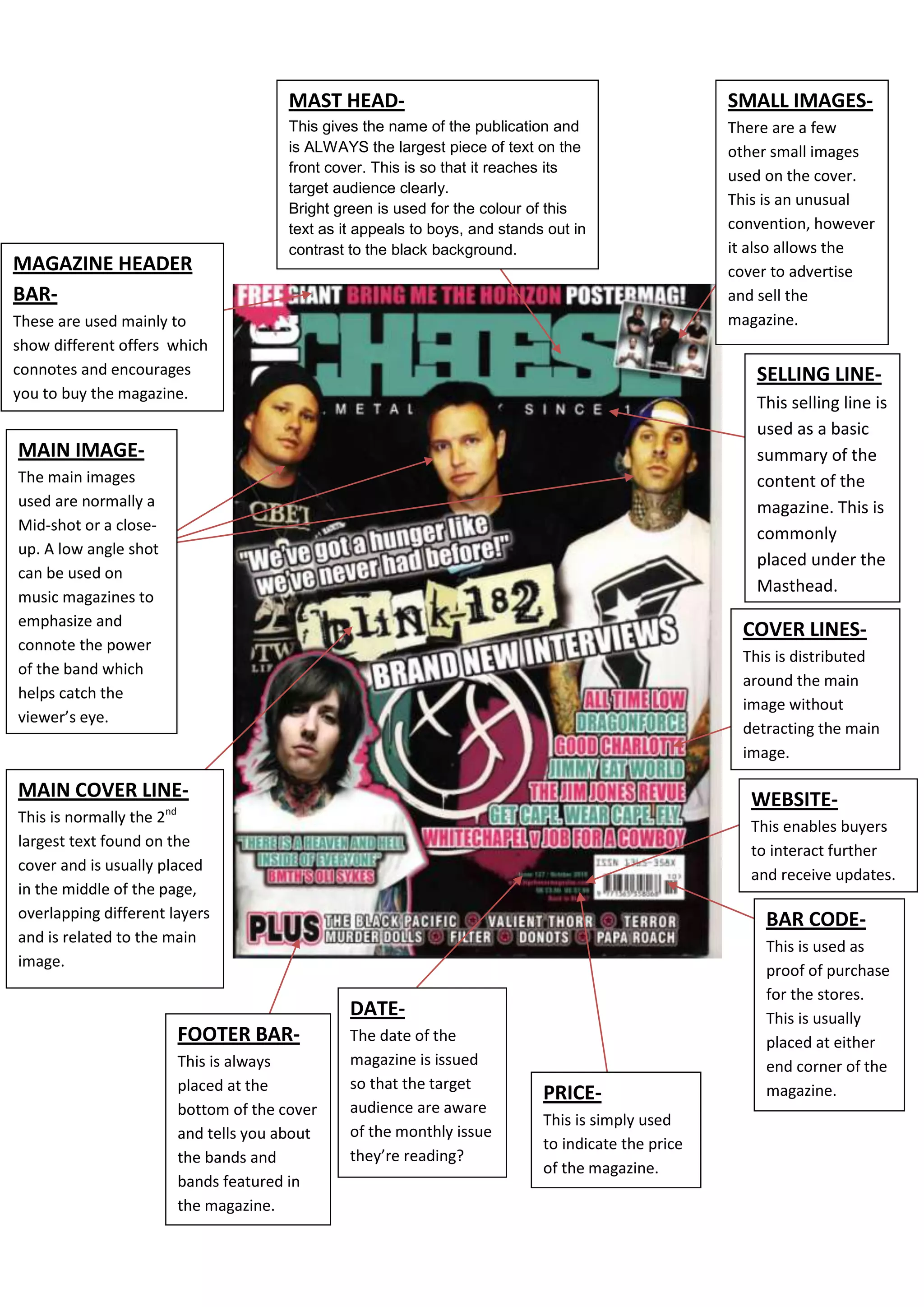 The document describes various design elements commonly found on magazine covers, including small images, the masthead, magazine header bar, main image, footer bar, website information, cover lines, selling line, main cover line, bar code, date, and price. Elements like the masthead, main image, cover lines, and main cover line are used to attract readers' attention and advertise the magazine's content. Additional elements provide information about issues, offers, and how to purchase the magazine.