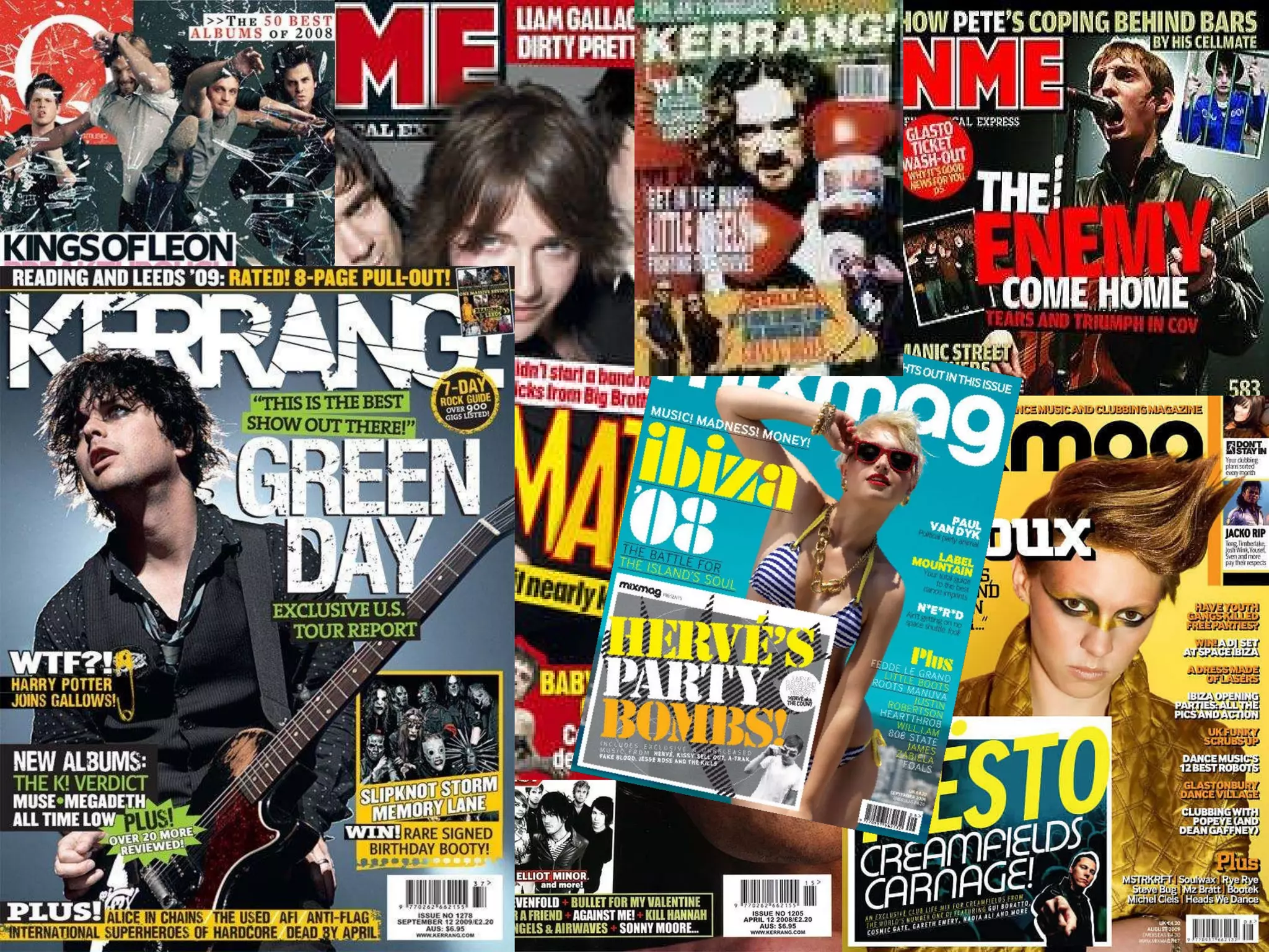 The document discusses three music magazines - Mix Mag, Kerrang!, and Q magazine. For Mix Mag, the reviewer notes the magazine seems aimed at dance music and features LaRoux on the cover looking ready to go out. For Kerrang!, the front cover features the lead singer of Green Day in a dark, spotlighted image capturing the band's style. For Q magazine, the reviewer praises its simple, uncluttered design that focuses attention on the featured band.