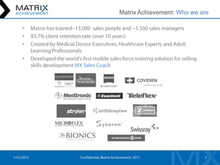 Matrix Achievement is a company that provides training platforms to help clients address common sales training challenges. Their platform offers an end-to-end solution that allows for 24/7 self-development to close the gap between training and real-world performance through proprietary tools that can be accessed at any time from any location.