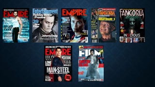This document outlines conventions for film magazine front covers. It discusses how the covers typically feature the main actor in character, with the masthead in a consistent font and color matching the film's genre. The main image takes over the center of the cover and is dimly lit to make the subject stand out. Close-ups are commonly used for supernatural films to show deformities, while medium shots featuring weapons are more common for slasher films. Text and taglines relate back to the central image and masthead to maintain brand identity. Color choices also aim to be aesthetically pleasing while conveying appropriate themes for the film's genre.