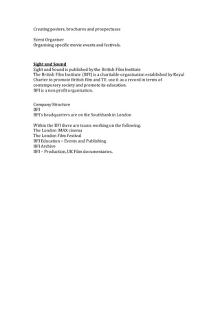 Future Publishing (PLC) publishes over 150 magazines and 40 websites across offices in the UK, US, and Australia. Their main source of revenue comes from magazines and websites, though they also have a contract publishing division. They divide their publications into different subject categories such as technology, games, film, and music.