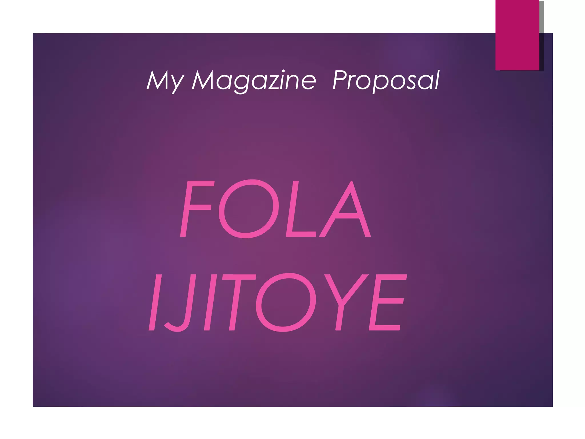 The document proposes a new magazine focused on up-and-coming Afrobeat and grime artists in the UK music scene. The magazine will be digital-only, available on tablets, phones and computers. It will feature these artists not currently covered by other magazines. The proposal discusses name options for the magazine, potential publishers, sample artists to include in the first issue, and the target 16-25 year old audience that is most likely to consume digital media.