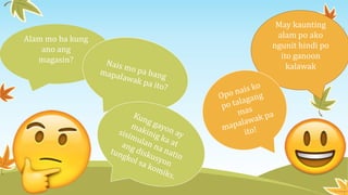 Ang dokumentong ito ay naglalarawan ng mga magasin, mga kauna-unahang magasin sa Pilipinas, at kanilang mga nilalaman at kontribusyon sa lipunan. Tinalakay nito ang mga halimbawa ng mga magasin tulad ng 'Lipang Kalabaw,' 'Telembang,' at 'Liwayway,' na nagbigay impormasyon at nagsulong ng kamalayan sa mga isyung panlipunan. Bukod dito, binanggit din ang mga modernong magasin at ang kanilang mga layunin at nilalaman para sa iba't ibang target na mambabasa.