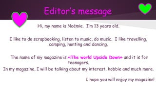 This magazine introduces Noémie, a 13-year-old editor who enjoys scrapbooking, music, traveling, camping, hunting and dancing. Her magazine, called "The World Upside Down", will discuss her interests, hobbies and more for teenagers. It includes a wordfind about music, crossword about dance, and profiles of her idols Taylor Swift and her grandfather Rémi. Information is also provided about the state of Alaska and Noémie's enjoyment of scrapbooking as a hobby.