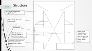 The document provides details for designing a magazine advertisement to promote a new album. It recommends using a silhouette background image for depth, with the main image featuring the lead singer. It suggests conveying an expression of longing on the singer's face. The advertisement would include information about the new album being released, including the name, release date, and where it can be purchased. The goal is to create a mysterious yet intriguing advertisement that effectively promotes the new album.