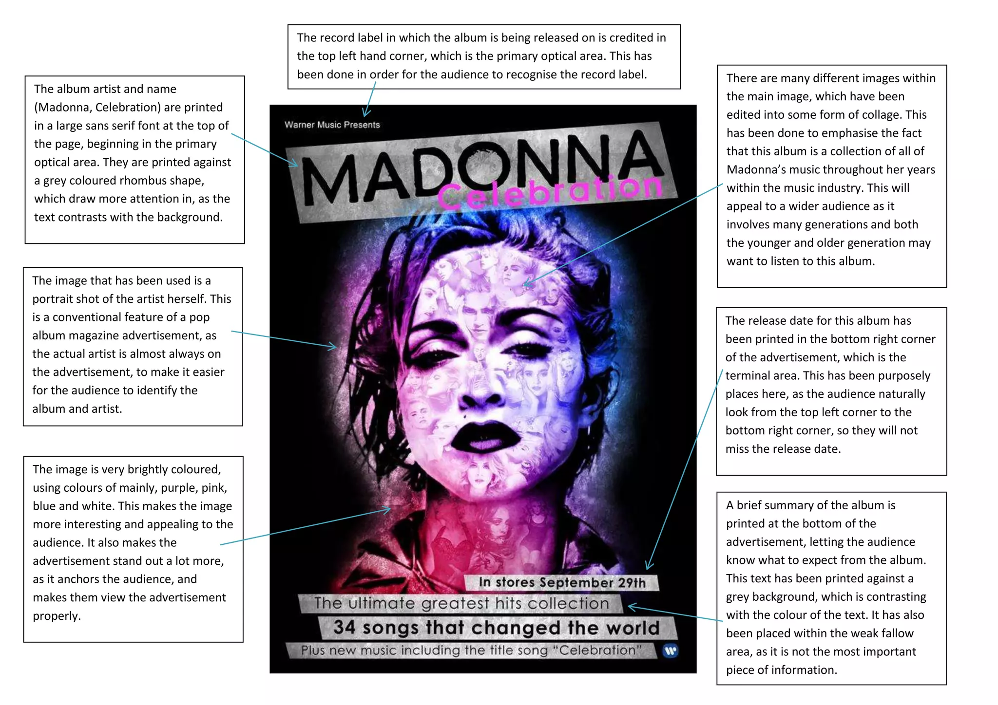 The album advertisement features Madonna's name and the album title "Celebration" in a large sans serif font at the top. Below is a collage image of Madonna featuring different colors to emphasize it is a compilation album. This will appeal to multiple generations by including Madonna's music over her career. The release date is printed in the bottom right corner, following people's natural eye movement. A brief album summary is at the bottom in the weak fallow area against a grey background.