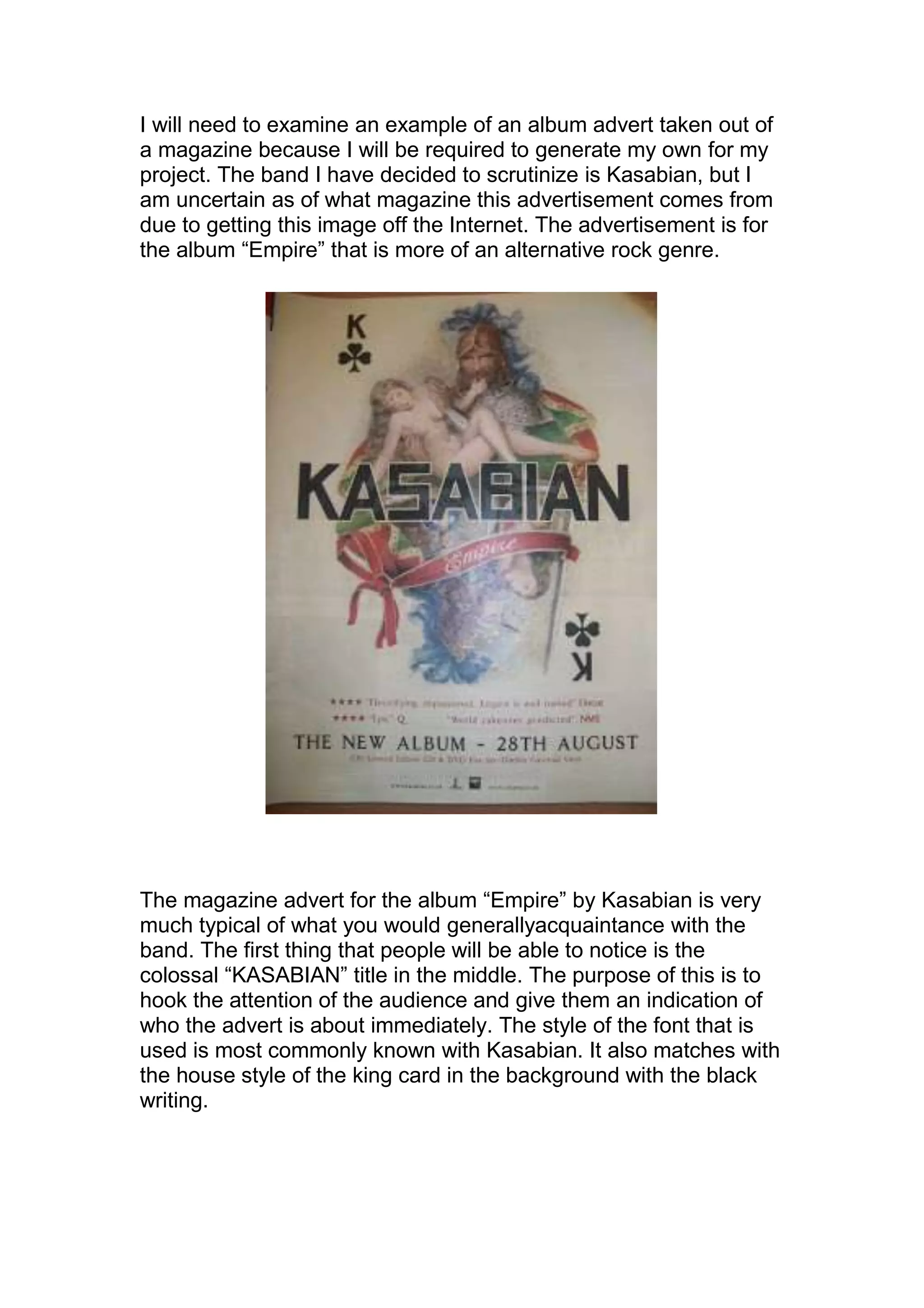The document discusses an album advertisement for the Kasabian album "Empire". It summarizes that the ad features: