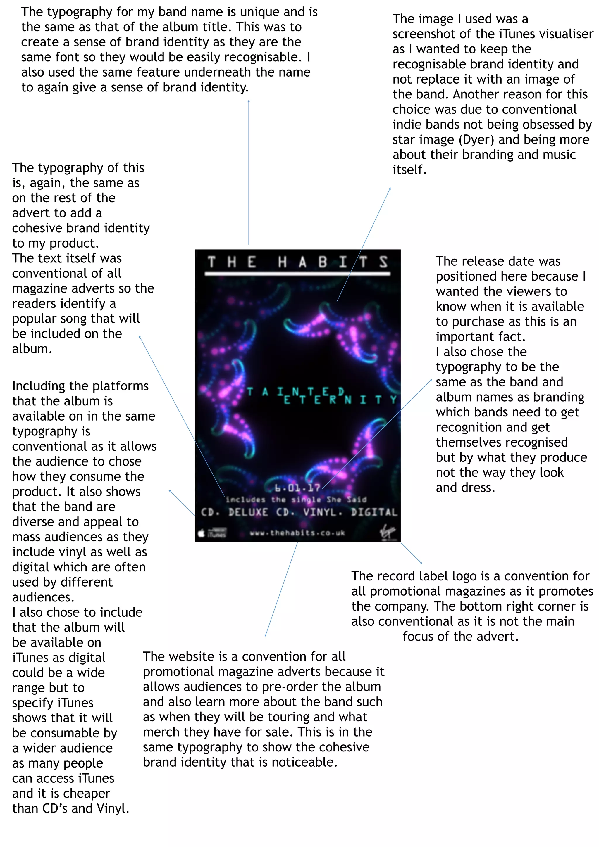 The document discusses the design choices made for a band's promotional magazine advertisement. Key points include: