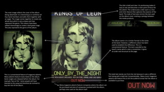 The magazine advertisement promotes a new album by a band. It features the album cover art as the main image, combining all four band members' faces. Text elements like the band and album names match the style and fonts used on the album cover to create synergy. Conventionally, the ad lists singles and information on where to purchase the album to encourage sales.