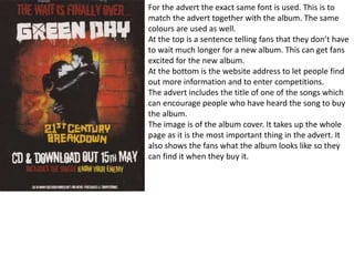 The document describes several music album advertisements. It notes similarities across the ads including large images of the album cover taking up most or all of the page, the album title and artist name in a large font, the release date, naming one or two songs, using the same font and color scheme as the album cover, and including the website address in small font at the bottom. The purpose of these design elements is to clearly advertise the album, showcase what it looks like, promote songs to draw in fans, and provide key release details while directing people to find more information online.