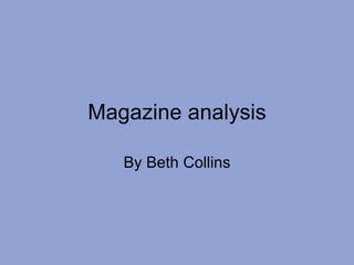 This magazine analysis document provides details on the layout and design conventions of several magazines.