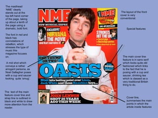 The NME magazine cover follows conventions like having celebrity images and eye-catching text and fonts. Details are given on the layout of contents pages, including use of colors, images and fonts to draw readers in.
