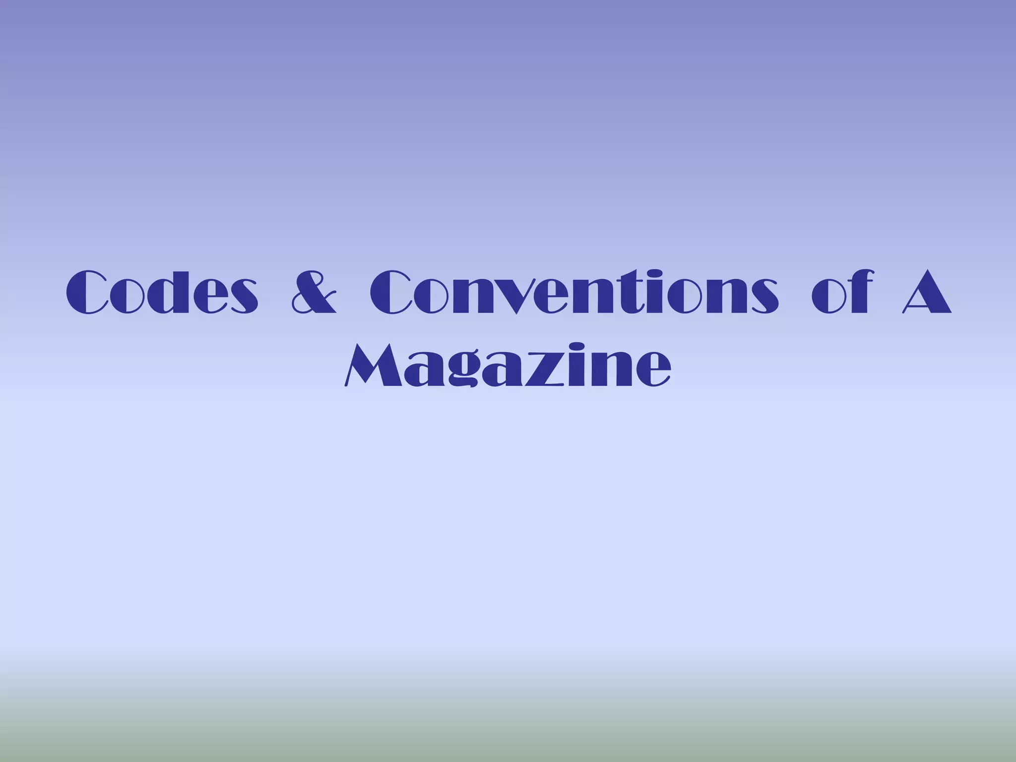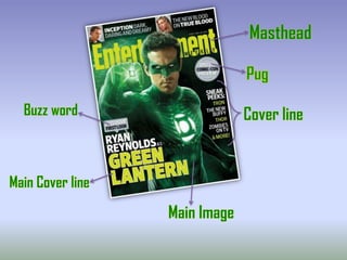 The document discusses various codes and conventions used on magazine covers. The masthead is the magazine's brand name written in the largest font size across the top edge of the cover. Cover lines are headlines of articles inside written on one side in a smaller font than the masthead. The main image in the center relates to the cover story and gains attention. Buzz words are used to attract customers and urge them to buy the magazine by highlighting exclusive content.