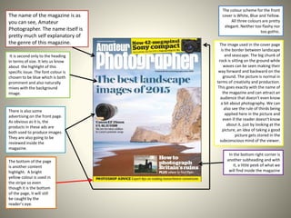 This document provides a detailed summary and analysis of the front cover and several interior pages of the magazine "Amateur Photographer". The summary describes the front cover layout and color scheme, noting the magazine title, issue highlight, and promotional ads. It also analyzes sample interior pages, including the table of contents, an "online photo of the week", links to social media, a message from the editor, and a double-page article spread about photographing ancient buildings. In total, the document examines various design and editorial elements across multiple pages to comprehensively summarize the magazine's content and visual presentation.
