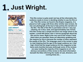 This document contains 11 summaries of magazine film reviews. The reviews vary in size and structure, with some being half a page and others only a few words. They utilize different combinations of images, fonts, colors and lengths of text to represent the films. The target audiences also differ across the reviews, ranging from children to adults. Overall, the reviews demonstrate different stylistic approaches to concisely advertising and reviewing films in magazines.