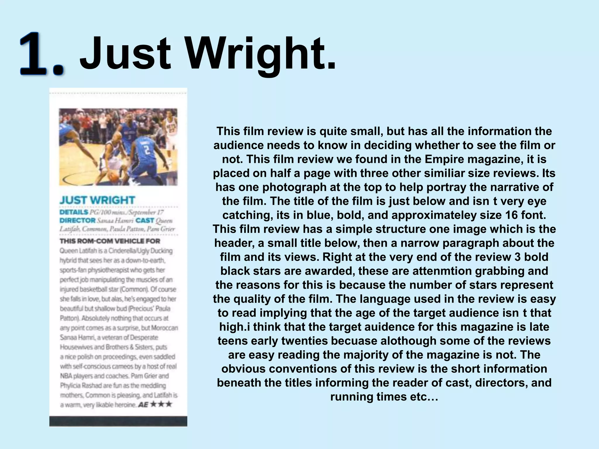 This document contains 11 summaries of magazine film reviews. The reviews vary in size and structure, with some being half a page and others only a few words. They utilize different combinations of images, fonts, colors and lengths of text to represent the films. The target audiences also differ across the reviews, ranging from children to adults. Overall, the reviews demonstrate different stylistic approaches to concisely advertising and reviewing films in magazines.