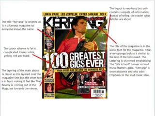 This document discusses various design elements used in magazines and newspapers, including mastheads, headlines, captions, dates, barcodes, menus, banners, covers, and pictures. It notes how these elements are used to guide the reader, signify importance, and draw attention through techniques like the rule of thirds in photographs and use of large capital letters. Color schemes and ways images are presented, with faces more prominent than text, also aim to engage readers.