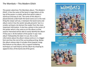 The document analyzes magazine advertisements for albums by three musical artists: The Wombats, The Killers, and Paolo Nutini. For each ad, the name of the band and album are prominently displayed at the top in large, contrasting fonts to catch the reader's attention. Additionally, each ad features imagery from the album cover to help readers easily identify it. The ads also include other details like release dates, popular song titles, or positive reviews to further promote interest in the albums.