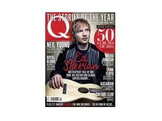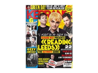 The cover uses various techniques to attract readers' attention and promote articles, including a prominent masthead in contrasting colors, splash images of featured artists, cover lines describing articles, and plugs highlighting special content. Interior pages similarly employ section headers, contents lists, prominent page numbers, and article previews to guide readers. Overall, the document examines how the magazine's layout strategically markets content to its audience.