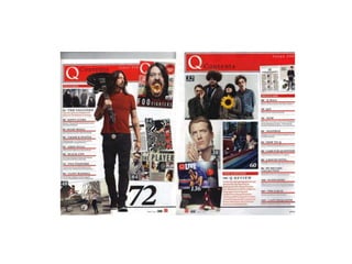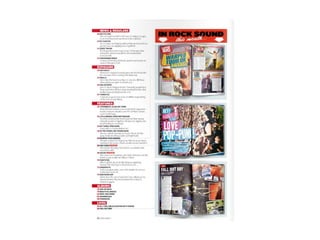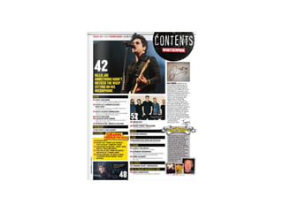 The magazine cover uses various design elements to attract readers' attention and promote stories, including a prominent masthead in red and white, cover lines in large fonts highlighting artists, and splash images of artists like Ed Sheeran. Interior pages also employ standard features such as contents listings, article text in multiple columns, and consistent branding with the magazine's color scheme and fonts to clearly present stories and guide readers through the issue. The document analyzes how all of these visual elements are strategically designed and positioned to engage audiences and drive sales.