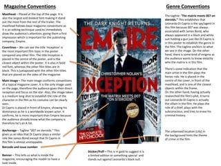The document analyzes the conventions used in magazine covers for films such as 'Inception', 'Shutter Island', and 'Gone Girl', highlighting elements like mastheads, coverlines, main images, and taglines. It discusses how these components attract audience attention, convey genre, and establish character roles, indicating the thematic depth of each film. Additionally, it outlines plans for applying these conventions in future magazine productions.