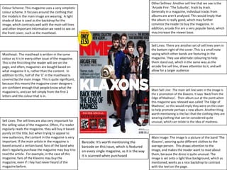 This document analyzes magazine covers and contents pages. It discusses elements like mastheads, sell lines, images, pull quotes, and color schemes. These elements are used to attract readers and promote the content. The document also notes conventions like listing the table of contents and including the cover image on contents pages. Individual magazines may have unique elements, like NME including a band index. Overall, the document examines how magazines use visual design to market their issues.