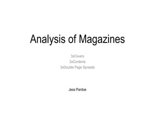 The document provides an analysis of magazine covers, contents pages, and double page spreads from various music and fashion magazines. Key points summarized: