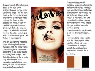 1. Magazine covers are analyzed for color palette, font, image composition and how they represent the musical genre. Simplistic color schemes with 3-4 colors are most suitable for music magazines.