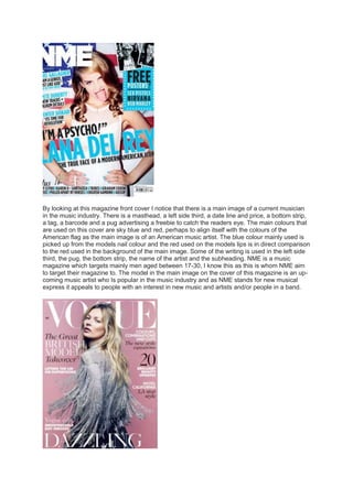 The document analyzes several magazine covers, noting elements like main images, colors used, target audiences, and how the models relate to the magazines' brands. It discusses covers from magazines like Vogue, featuring Kate Moss; ELLE, featuring Alexa Chung; GQ, featuring David Beckham; and how aspects of each cover are tailored to the publication's intended readership.