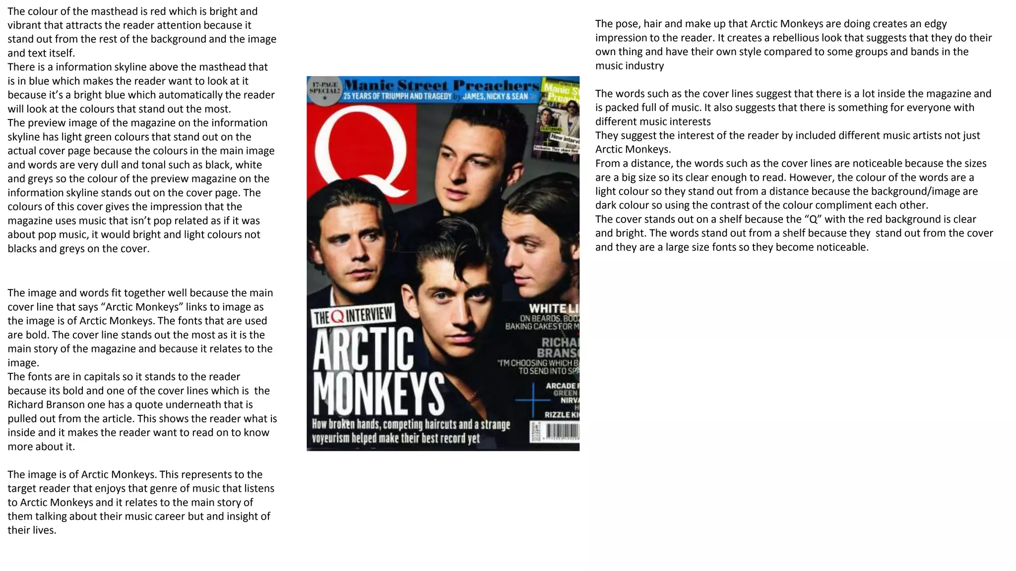 The masthead is red which attracts attention as it stands out from the background. There is an information skyline in blue above the masthead. The preview image on the skyline has light green colours that stand out against the dull tones used elsewhere on the cover. The colours give the impression that the magazine focuses on non-pop music genres. The image and words fit together well as the cover line references the image of Arctic Monkeys. The fonts used are bold to draw attention. The cover line stands out the most as the main story. The fonts are in capitals so they stand out clearly to readers. The image represents the target readers who enjoy that genre of music. The cover stands out on shelves due to the