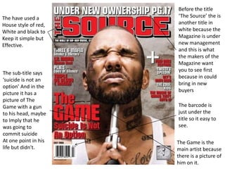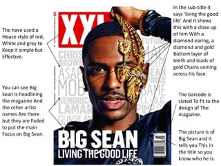 The document summarizes the cover designs of three different magazines. Each magazine cover features a prominent hip hop artist as the main focus. Big Sean is featured on the first cover surrounded by faded other artist names. The second cover features The Game with a gun to his head, implying he once considered suicide. The third cover shows Kendrick Lamar in a serious pose to portray him as "the new god mc". Common elements across covers include the title placed above the artist photography and barcode below for easy scanning.
