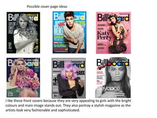 The document provides guidance for a student project to design the front cover, contents page, and a double-page article spread for a new music magazine. Students will use Photoshop and InDesign and must include a minimum of four original images. Possible cover ideas featured bright colors and a main appealing image. Example contents pages were sophisticated with stylish writing and canted angled photos. The double-page spread examples featured a large artist image on one page paired with an interview on the other, using elegant fonts to title the pages.