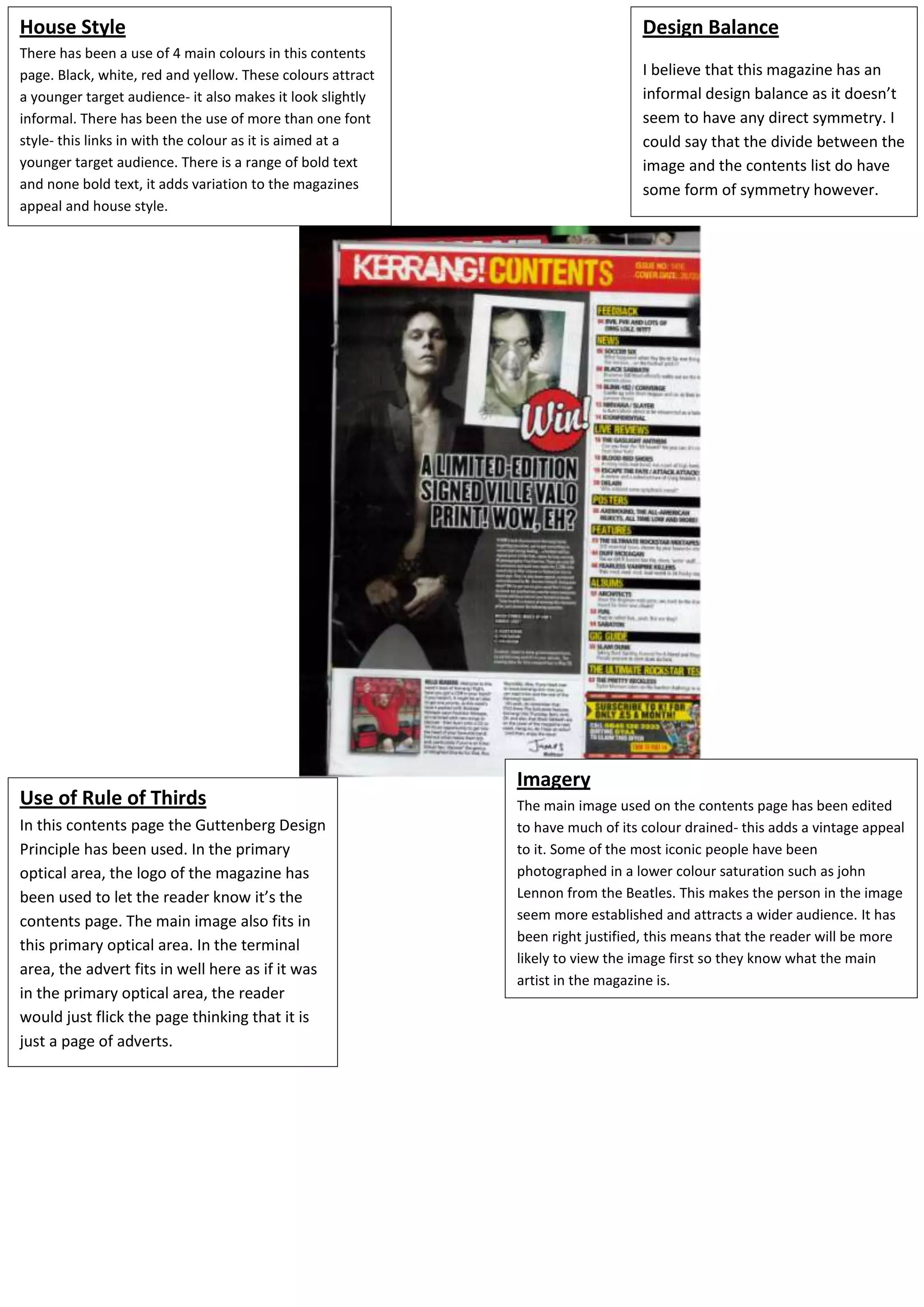 The document discusses the design elements used on a magazine contents page, including its use of color, fonts, imagery, and layout. It notes the inclusion of black, white, red and yellow to attract a younger audience and its informal design balance without direct symmetry. The main image has been edited to have drained color for a vintage appeal and iconic people are photographed with lower color saturation.