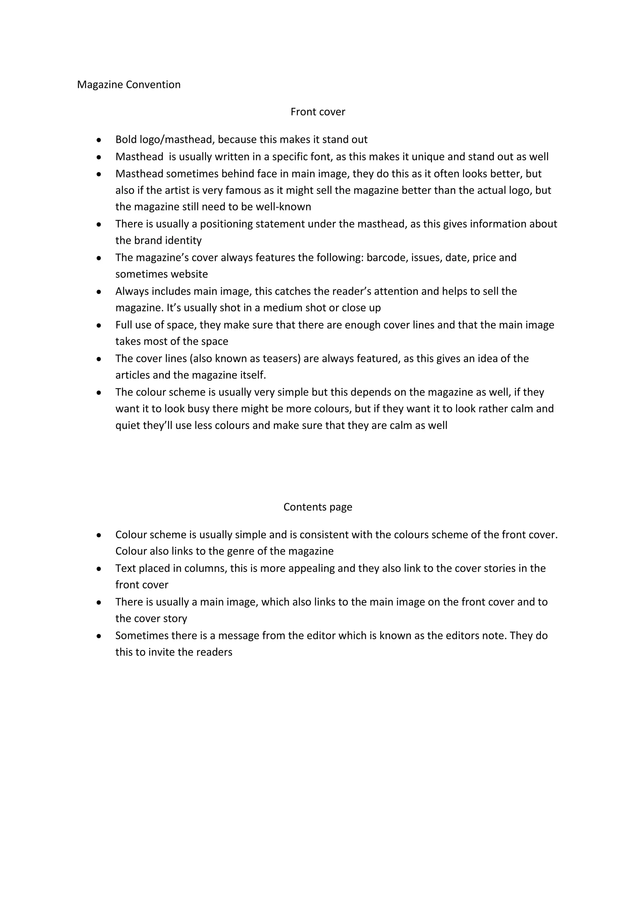 The document outlines magazine cover and contents page conventions. It notes that magazine covers typically feature a bold masthead in a unique font above the main image. Cover lines tease the articles, while the barcode, date, price and website are also included. Contents pages continue the color scheme and layout of the cover, with text in columns linked to cover stories and a main image connecting the two pages. An editor's note sometimes welcomes readers.