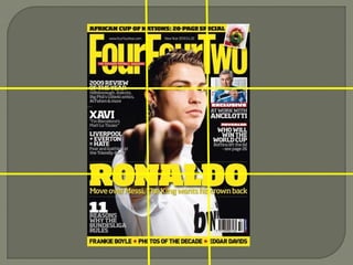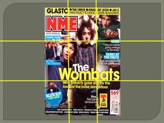 The document describes the typical layout and design conventions of magazine covers. It notes that covers often use a grid system for placement of elements like photos, headlines, and text. For example, magazines with single person photos often place the eye line at the top third of the cover. Headlines usually appear in the lower third. Text is often placed in the left third which is most visible on store shelves. Consistent use of fonts, colors, imagery style and grid placement help create a recognizable brand identity and make important information easily scannable for readers.